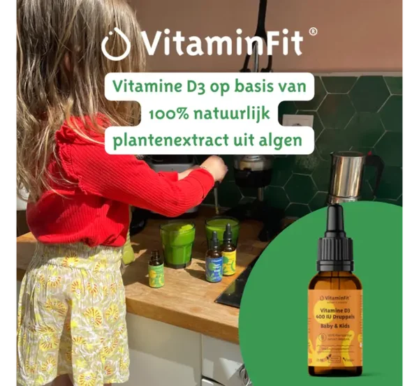 VitaminFit Vitamine D3 voor baby’s is speciaal ontwikkeld met het oog op de unieke behoeften van baby's en jonge kinderen. De vitamine D3 druppels bevatten de goed opneembare vorm cholecalciferol, is afkomstig uit algen, waardoor het een 100% plantaardige en duurzame bron is, ideaal voor ouders die bewust kiezen voor natuurlijke producten.
