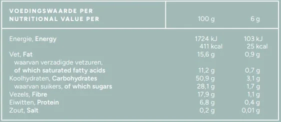 6 genergie 1724 kJ, 411 kcal / 103 kJ, 25 kcal vet 15,6 g / 0,9 g vet waarvan verzadigd 11,2 g / 0,7 g koolhydraten 50,9 g / 3,1 g waarvan suikers 28,1 g / 1,7 geiwitten 6,8 g / 0,4 g vezels17,9 g / 1,1 g zout 0,2 g , 0,01 g